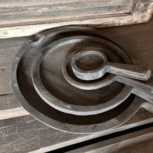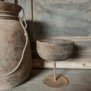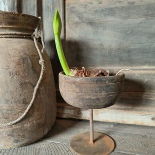 Houten schaaltje op voet. Het voetje is van staal, heeft een roest kleur. Let op, ze zijn uniek.