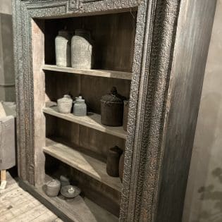 Een prachtige, unieke, handgesneden boekenkast van oud houd. Afmetingen: B165x H200x D46cm